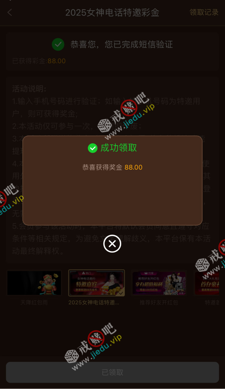 特邀自助领取彩金的,再优惠里面去验证试试,验证成功领到的就是特邀了,不需要接到电话了,没有就勿喷!